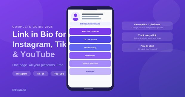 Complete guide to link in bio for Instagram, TikTok and YouTube in 2026. One page for all your platforms. Free tool included.