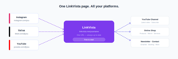 instagram.com/tu → linkvista.me/tu → tutti i tuoi contenuti tiktok.com/@tu → linkvista.me/tu → tutti i tuoi contenuti youtube.com/@tu → linkvista.me/tu → tutti i tuoi contenuti