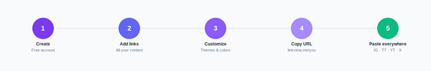 Copia linkvista.me/tuonome e incollalo in Instagram, TikTok, YouTube, Twitter/X e nella tua firma email.